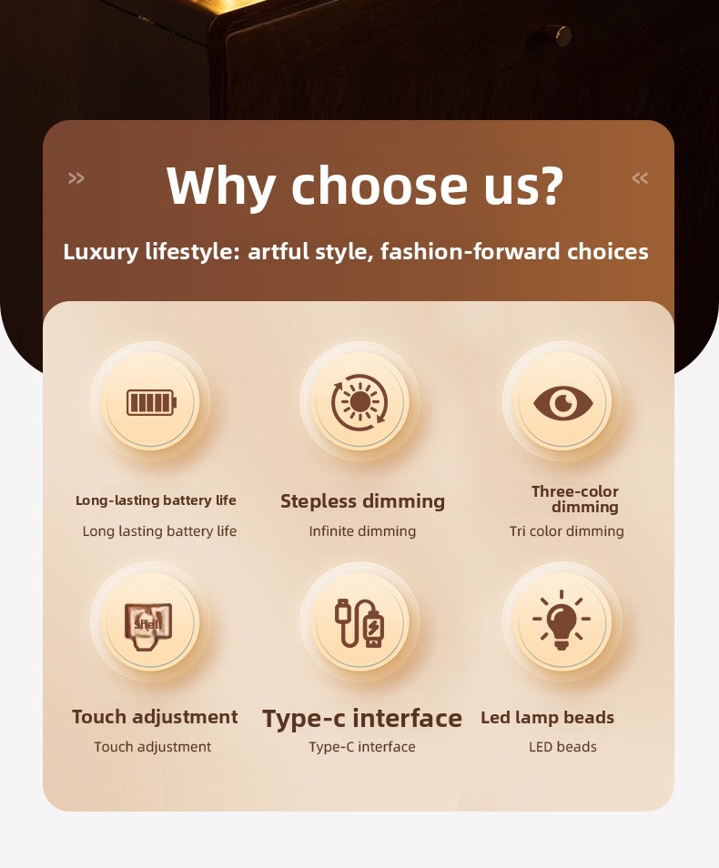 Multi-functional Lighting: Rechargeable LED light with three-color dimming and stepless brightness adjustment for customizable ambiance.