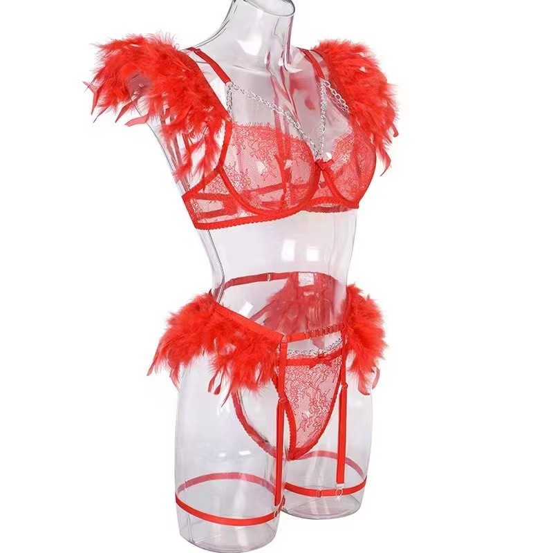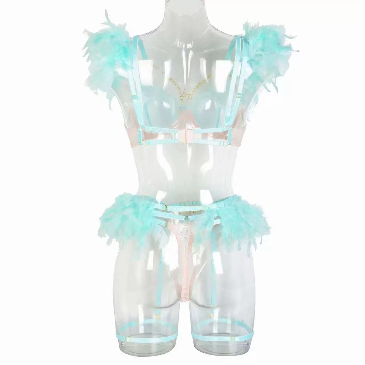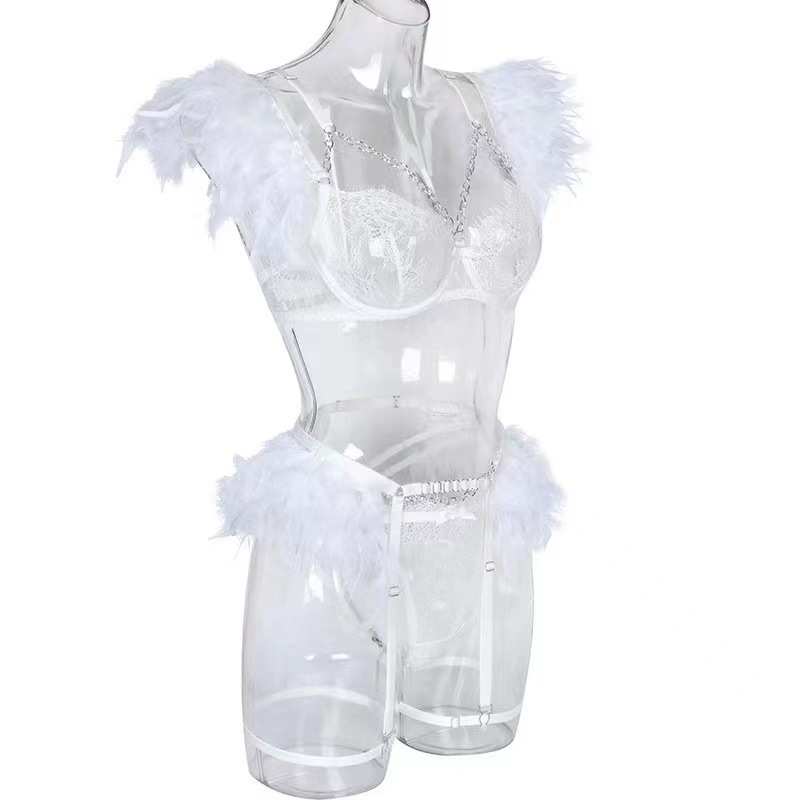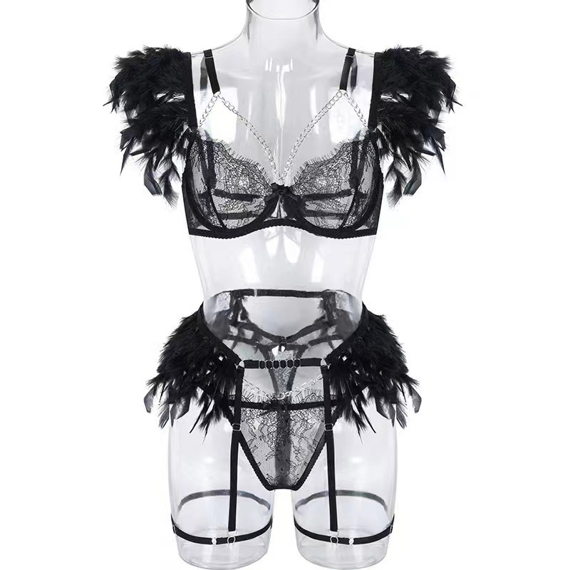 Intricate Design: Features metal chains, lace, feather trims, and eyelash details for a unique look.