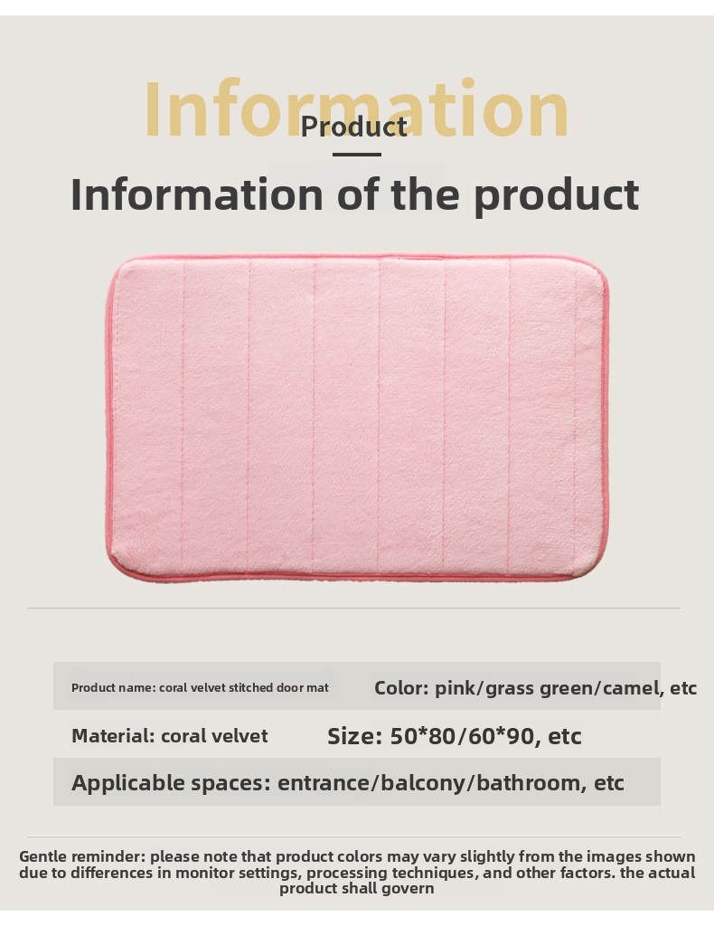 Coral Fleece Material: Soft, plush surface with high water absorption for bathroom and entryway use.